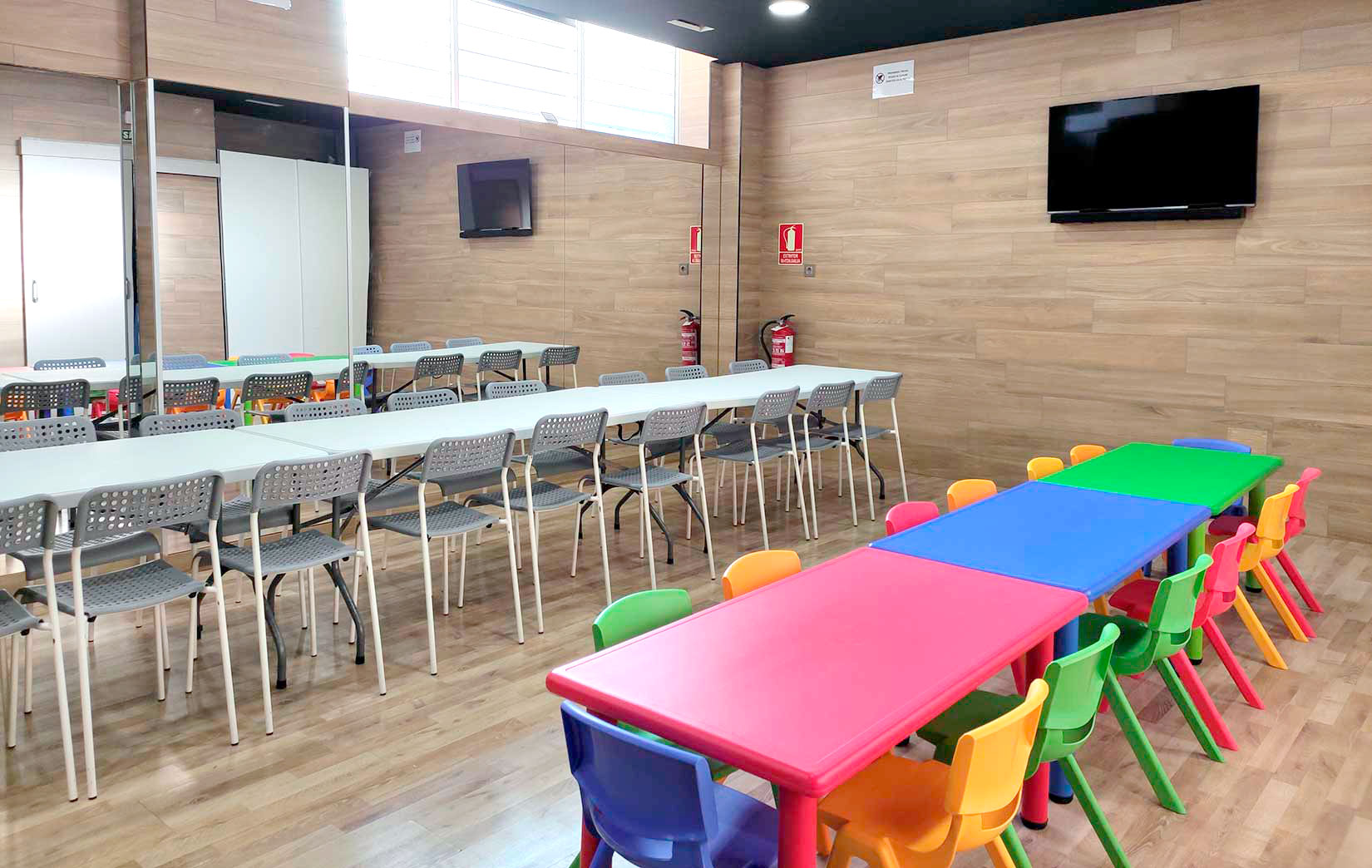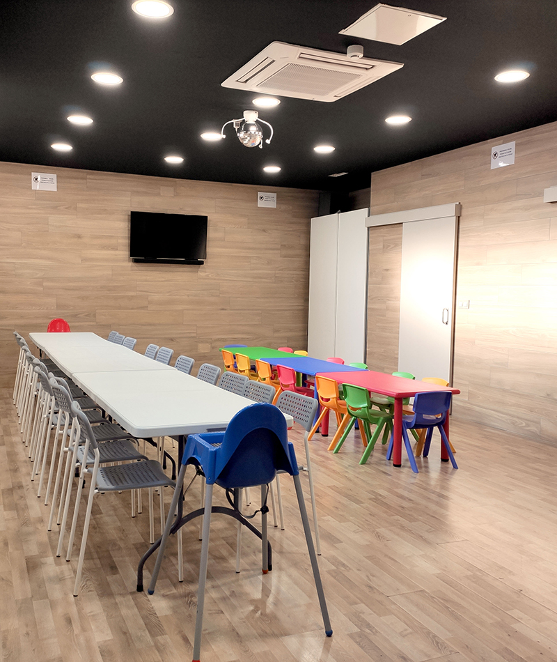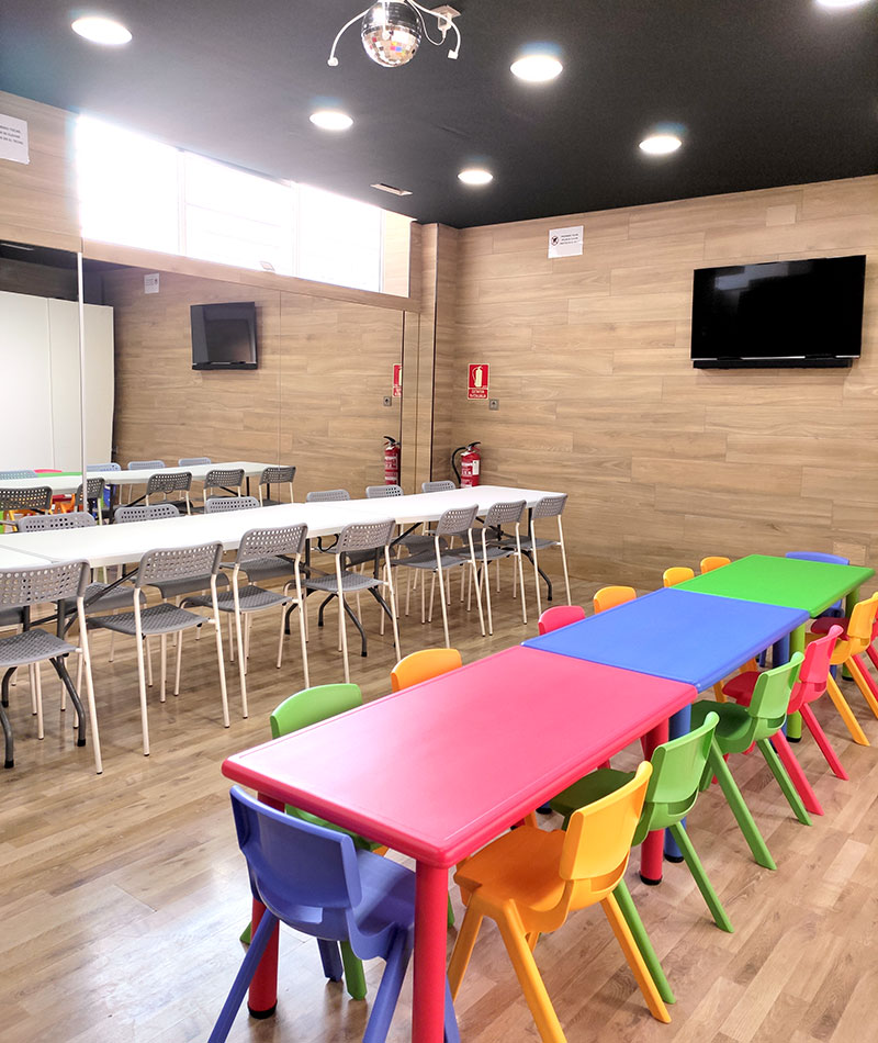 Sala polivalente con mobiliario (mesas y sillas para niños y adultos)