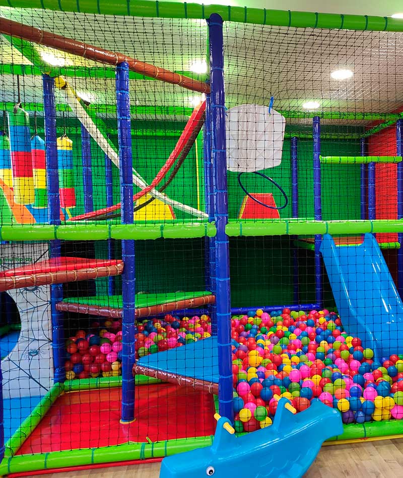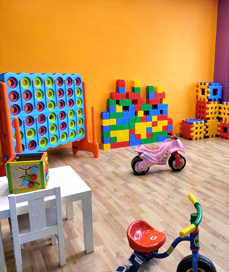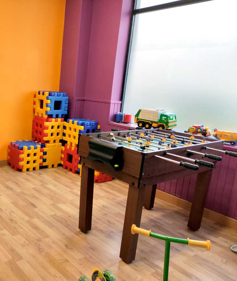 Zonas de juegos con piezas gigantes de contrucción, cuatro en raya gigante, futbolín, correpasillos y diversos juguetes